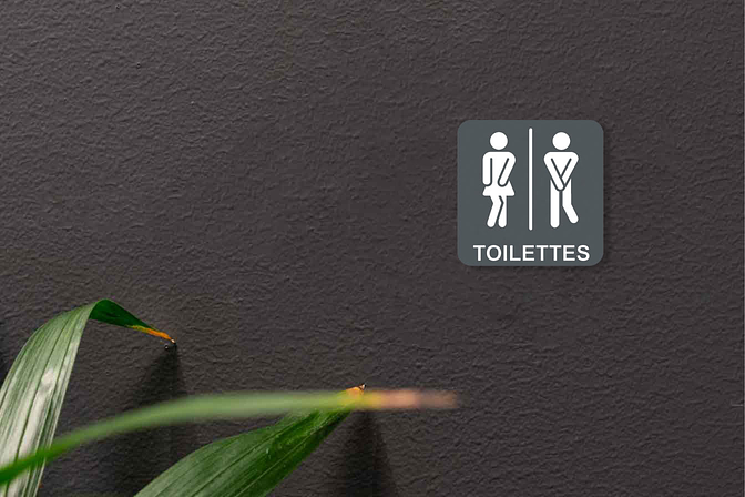 Plaque en plastique gravée pour toilettes. Plaque grise et blanche avec image et texte. Taille 150x150mm- Personnalisez votre panneaux toilettes en quelques clics sur notre site.